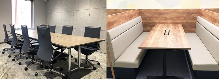 従来3室だった会議室を5室に増加、また執務室内にファミリーレストランのようなボックス席を設け、チーム内でのちょっとしたミーティングを行いやすい環境を用意。