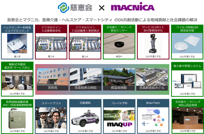 半導体、ネットワーク、サイバーセキュリティ、AI/IoTにおけるトータルサービス・ソリューションプロバイダーの株式会社マクニカ(本社:神奈川県横浜市、代表取締役社長:原 一将、以下マクニカ)は、本州最北端で医療介護・ウェルネス事業を複合的に経営する社団法人 慈恵会(本社:青森県青森市、理事長:丹野 智宙、以下慈恵会)およびそのグループ会社で観光業や飲食業などを経営する株式会社 城ヶ倉観光(本社:青森県青森市、代表取締役:宮本 健四郎)が進めるDX(デジタルトランスフォーメーション)の共創パートナーとして、世界最先端デジタルテクノロジーとマクニカが持つインテリジェンスを掛け合わせたサービス・ソリューションを包括的に提供することで、慈恵会グループにおけるサービスの価値向上とスタッフの負担軽減、労働力不足解消を実現し、さらには地域貢献、地方創生の支援を行うことを発表いたします。