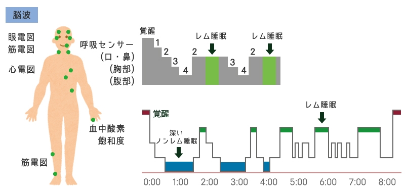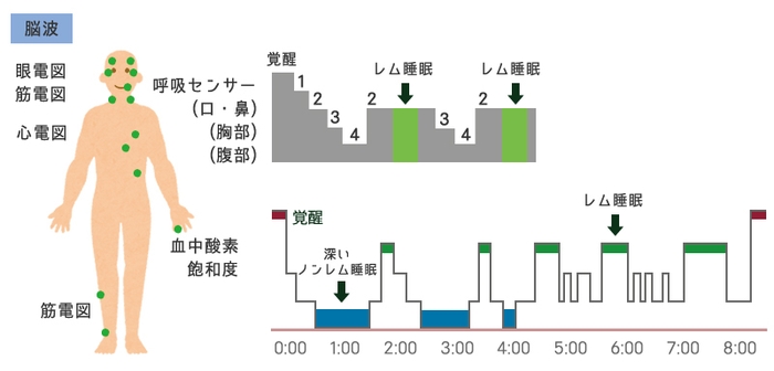 睡眠は、深いノンレム睡眠(段階3.4)から始まり、睡眠欲求が低下する朝方に向けて徐々に浅いレム睡眠(段階1.2)が繰り返し出現し、睡眠後半に向けて徐々に一回ごとのレム睡眠時間が増加してゆきます。深いノンレム睡眠は高等生物で出現し昼間に酷使した大脳皮質を睡眠前半で集中的に冷却し休養をとらせます。レム睡眠では、全身の筋肉が弛緩し、エネルギーを節約して身体を休めます。