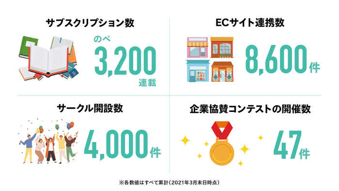 個人も法人も混ざり合って、好きなものを見つけたり、おもしろい人に出会えたりするチャンスが広がっています。2014年4月にサービス開始し、約1500万件の作品が誕生。会員数は380万人(2021年3月時点)に達しています。