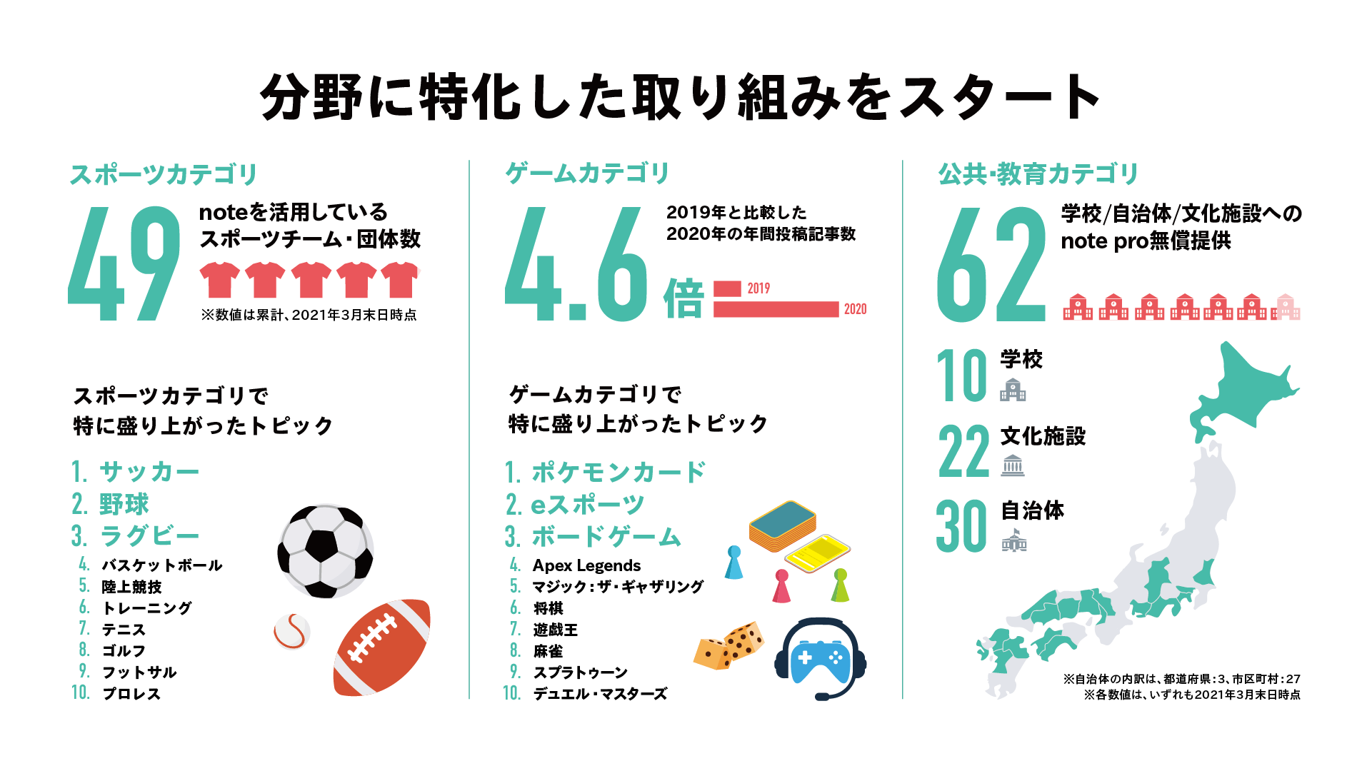 noteの会員数は前年同月比1.8倍の380万人、記事数は前年同月比2倍の1,500万件と、この一年でおおきく成長しました。コロナ禍での「伝えたい」「つながりたい」という気持ちから、人々にとってオンラインでの発信の重要性が高まっていることがうかがえます(※1)。