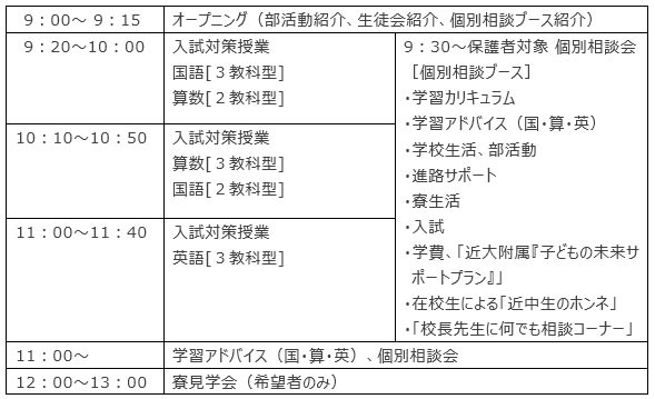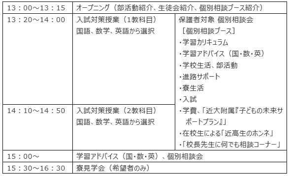 受験の参考となる入試対策授業や個別相談会のほか、10月26日(土)には「近中模試」も実施します。また、経済的な理由等で進学が難しい生徒を支援する学校法人近畿大学独自の就学支援制度「近大附属『子どもの未来サポートプラン』」についての説明会も実施します。