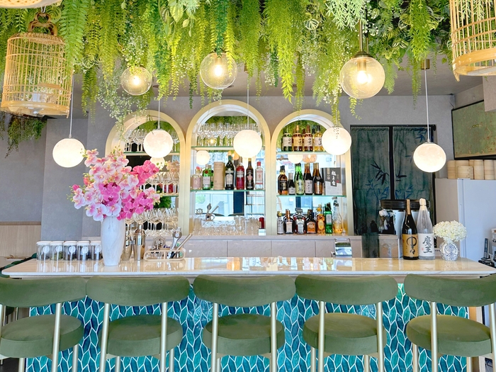 バーカウンターには、月を象ったライトが優しく灯り、まるで月明かりに包まれているかのような幻想的な雰囲気を演出します。天井一面に広がるグリーンが都会の喧騒を忘れさせ、まるで森の中に迷い込んだような安らぎを感じていただけます。