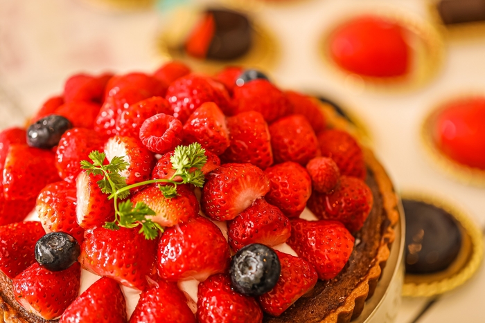 〈デザート〉トリコロールショートケーキ/パステルブルーマカロン/チョコレートロリポップ/カヌレ/マドレーヌ2種(チョコ・プレーン)/カップケーキ/アイシングクッキー/クレームブリュレ/パリブレスト/パリスジュレ(苺・ブルー)/コーヒーゼリー/クレームダンジュ/シャルロットフリュイ/ハートムース/タルト・オ・フレーズ/フロマージュムース/オリジナルモンブラン/焼きチョコ/ストロベリーシフォンケーキ/エンゼルフードケーキ/ムースショコラ