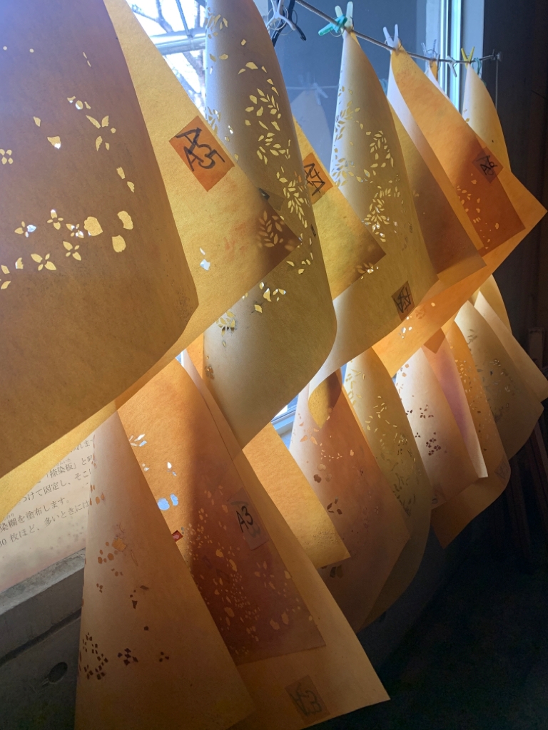 日本では「型紙」という染める道具によって和紙文化が融合されており、複数枚の型紙を重ね合わせて染めていく為に、当工房では多数の型紙を保管しています。それが他の工房とは違い桁違いの型紙が保全されている理由です。