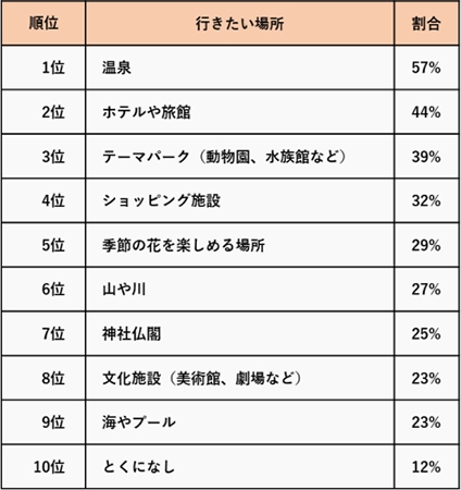 家族での旅行に限らず、国内の旅行先として大人気の温泉が1位となりました。温泉にゆっくり浸かって癒されるのはもちろん、家族で温泉街を歩いたり、周辺観光スポットを巡る楽しさもあります。