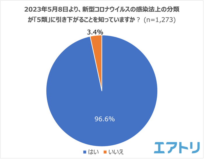 新型コロナウイルスの感染症上の分類引き下げについては多くの人が認識しており、認知度は96.6%に上りました。「知らない」人は3.4%でした。