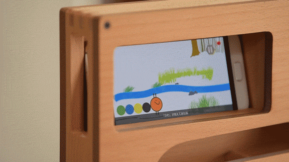 - ひらがなブロックにはRFIDタグが埋め込まれ、赤いリンゴ部分のリーダーにかざすことで文字を読み取り 、Bluetoothでスマートフォンに表示されます。