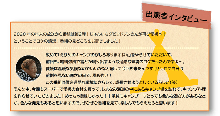 【愛媛朝日テレビ】じゅんいちダビッドソンが再び愛媛に!無人島でキャンプに挑戦!