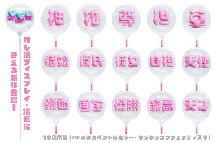 中でも、ソーシャルゲームやカードゲームで最高ランクのレアリティのキャラやアイテムを示す際に使用される「SSR」(Super Special Rareの略)は、キラキラコンフェッティ入りのスペシャル仕様でお届け。想いやワクワクをそのまま形にするバルーンとなっております。