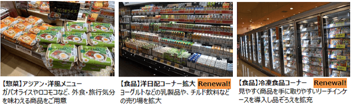 今回の改装では、商品ケースを変更・増設し、毎日の食卓を彩る生鮮食品や忙しい時に助かる手作りお惣菜、便利な冷凍食品の品ぞろえを拡充することで、在宅時間の長期化で高まっている内食・中食ニーズに対応いたします。