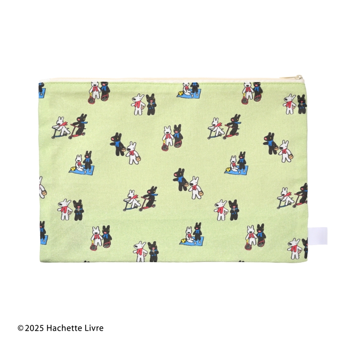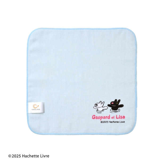 夏らしい涼やかなイエローグリーンが映えるトラベルポーチは、中身がひと目で分かるメッシュを使用。裏面には、リサとガスパールがキックボードを楽しむ姿やピクニックの様子など、お出かけのワンシーンを描いた総柄をデザイン。ミニタオルはまるで海を思わせるような爽やかなパステルブルー。ふたりがまるで海に浮かんでいるようなデザインに、淡いブルーの縁取りでアクセントを加えました。