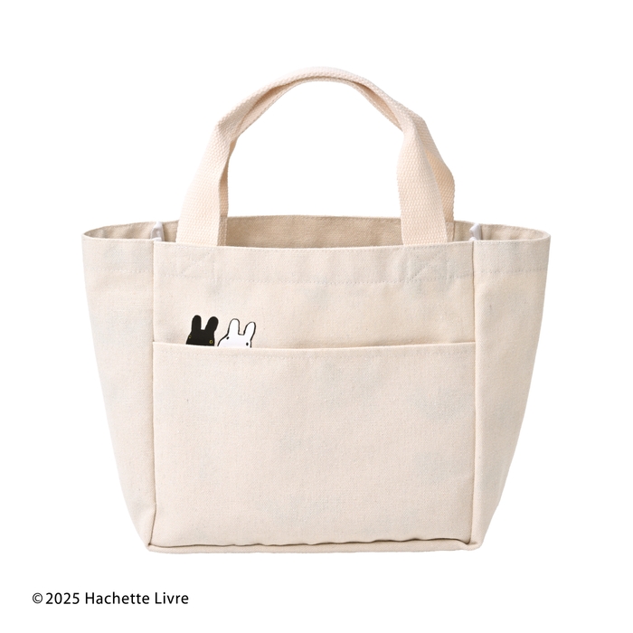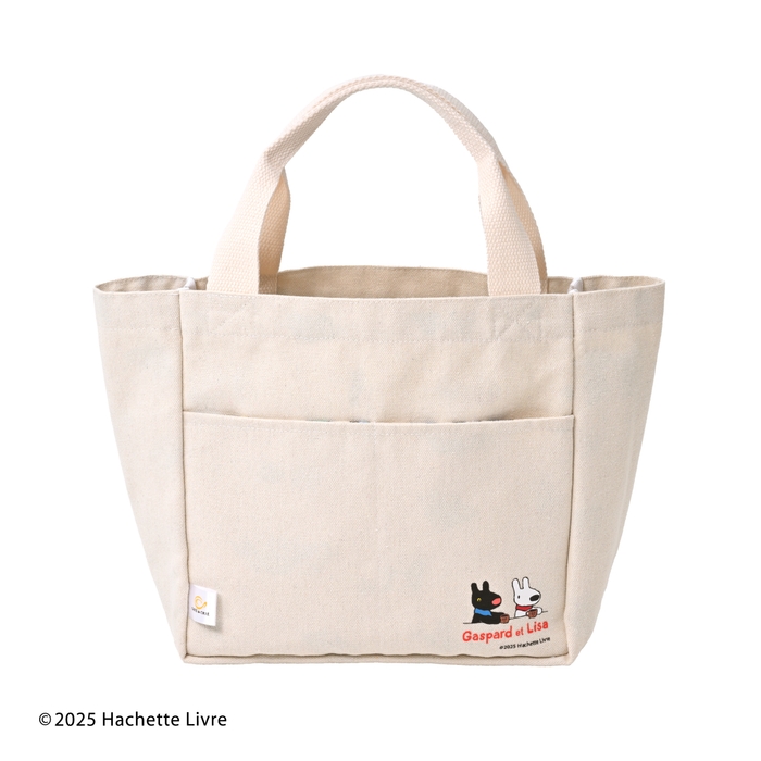 どんなファッションでも使えるナチュラルカラーのバッグ。ワンポイントとして、表面には、コーヒーを片手にくつろぐリサとガスパールを、裏面にはポケットからひょっこり顔をのぞかせるふたりの姿がデザインされています。内側には総柄をあしらい、くじらやイルカ、ワニなどの浮き輪に乗ってプールを楽しむ、ふたりの夏の楽しいひとときを描いています。