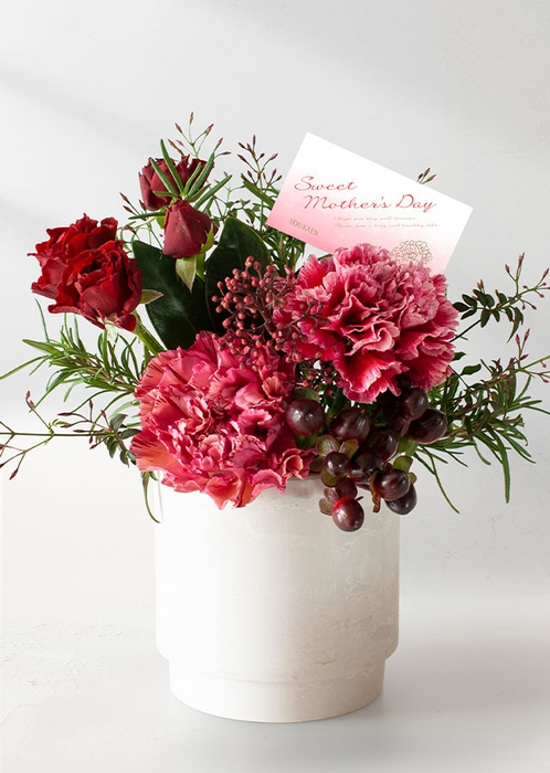 カーネーションにもこだわり、くすみピンクや、シックなブランレッドを使う事で少し大人の雰囲気のある花束やアレンジメントは、& YOUKAEN THE STOREのフローリストが新鮮な花材を厳選しデザイン、バラや季節のお花が母の日を贅沢に彩ります。