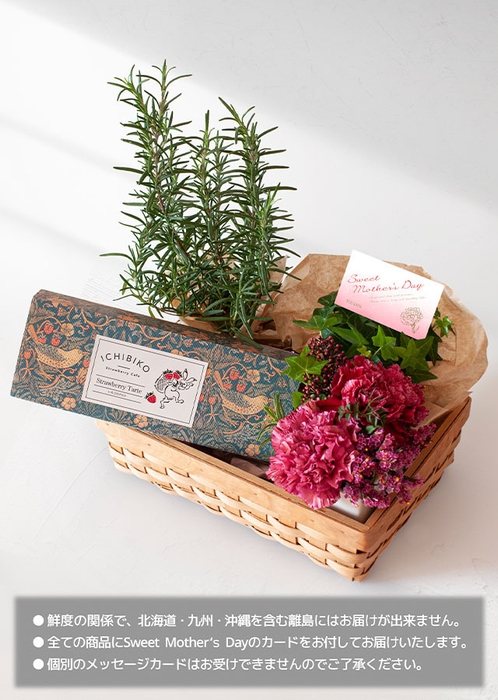 「甘く優しいひと時 / Sweet Mother's Day」をコンセプトにした母の日限定のコラボ商品もご用意。いちご、いちごのタルト、焼き菓子など、お母さんと過ごす心が満たされるシーンに合わせて開発したフラワーギフトは、下北沢のフローリストが手がける心のこもったデザインです。