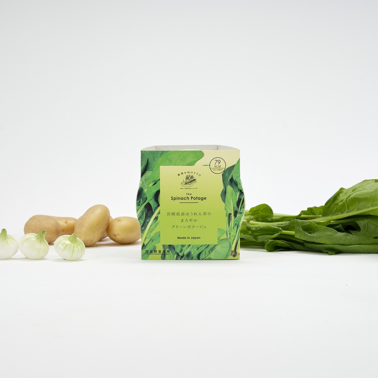 「日本のおいしい野菜をもっと手軽に食卓へお届けしたい」そんな思いで野菜そのもののおいしさが味わえるように開発された野菜をMOTTOのポタージュシリーズ。今回主役となるほうれん草は1年を通して温暖な気候の宮崎県産のみにこだわりました。日本有数の日照時間と温暖な気候で太陽の光をいっぱいにうけて育つほうれん草は、まろやかな甘みとえぐみの少ない濃い風味が特徴です。しっかりと味の濃いほうれん草をお楽しみいただくために丁寧に裏ごしを二度行い、繊維のざらつきをしっかり取り除き、とろけるようななめらかな舌触りに仕上げています。宮崎県産のほうれん草は裏ごしを加えても野菜の輪郭をしっかりと残しており、ほうれん草ならではの風味を感じられる味わいです。
