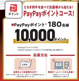 県内のとちぎ和牛提供店でとちぎ和牛メニューを食べた方を対象に応募券を配布し、応募した方の中から抽選でキャッシュレス決済サービス(PayPay)のポイントをプレゼントします。