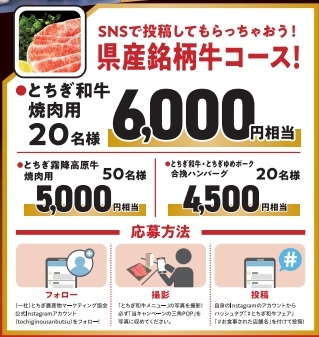 県内のとちぎ和牛提供店でとちぎ和牛メニューを食べ、画像を SNS(Instagram)で投稿した方の中から抽選でとちぎ和牛・とちぎ霧降高原牛等をプレゼントします。