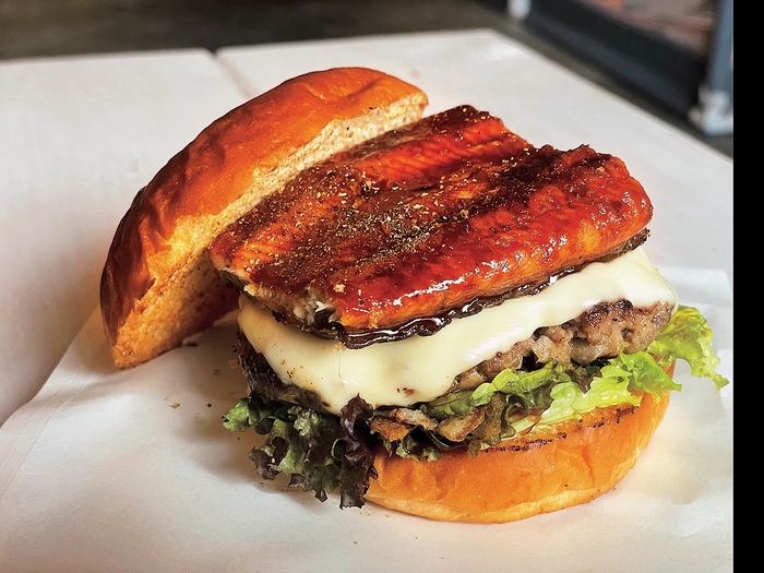 鹿児島県産のうなぎと黒毛和牛のパティ、濃厚チーズを挟んだスタミナ満点バーガー。