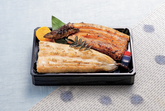 桜島の火山灰で灰干しした鹿児島県大隅産うなぎの「白焼き」と「蒲焼き」を一度に味わえる一折。
