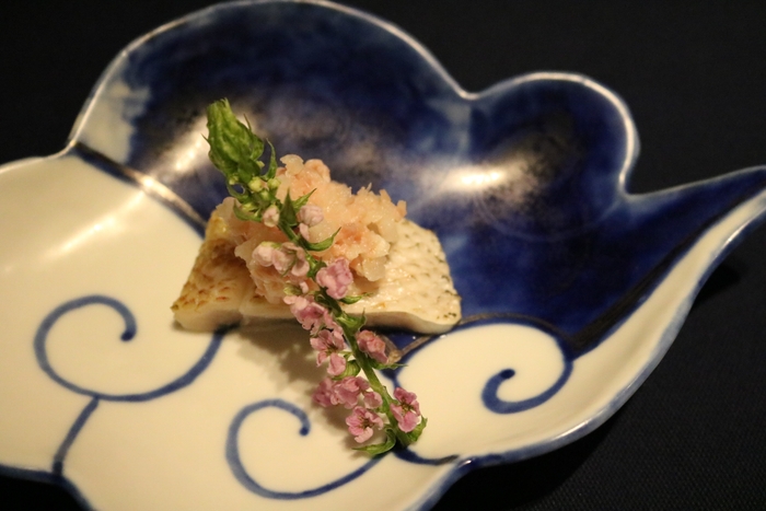 地元おなじみの“のどぐろ”を使って、新しい魅力を引き出す一品です。“のどぐろ”は、芳醇な香ばしさを引き立てるために、皮目をしっかりと炙り、付け合わせの生ハムと大根は細かく刻み、柚子果汁と合わせ、さらに生ハムを細かく叩いたものをたっぷりと混ぜ込みました。のどぐろの豊かなコクと、生ハムの熟成したうま味は非常に相性のよいものです。海の幸と山の幸の、新しい出会いを楽しめます。