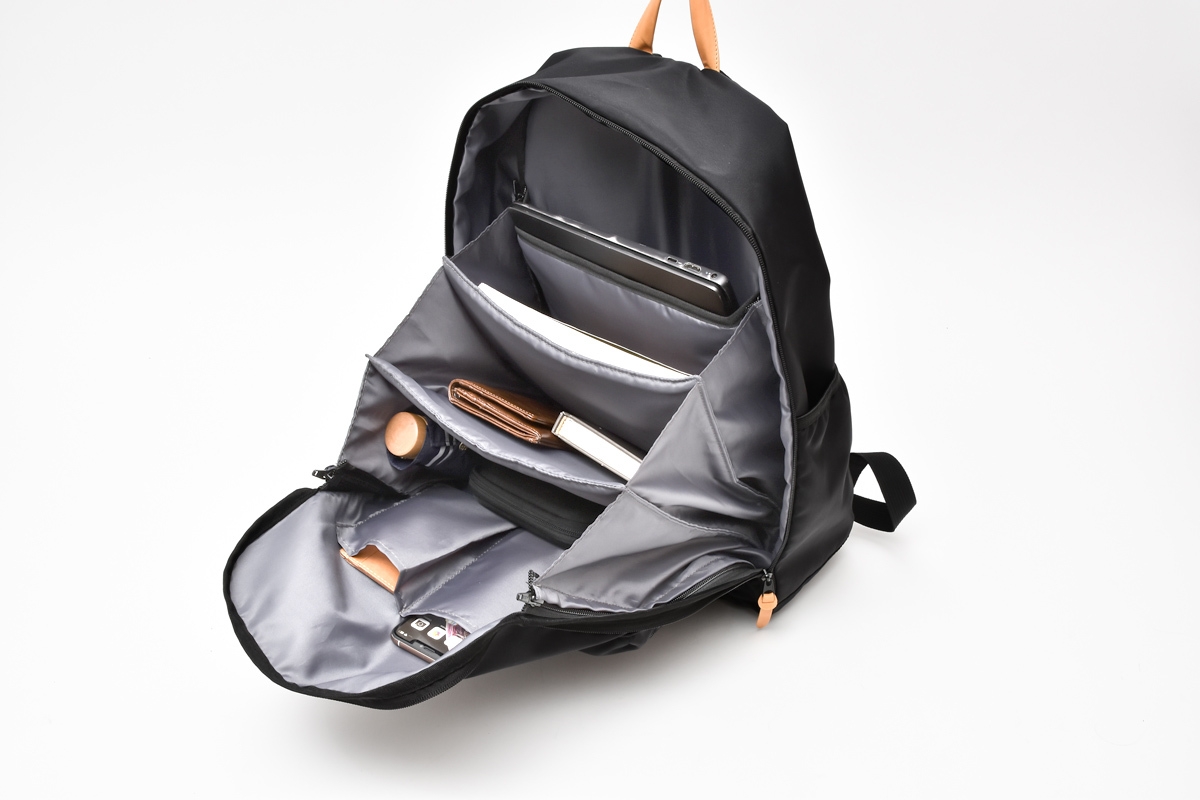 ジャバラリュックのインナーは、ファスナーで脱着できるようになっており、お使いいただく人の目的に合わせて2種類のインナーをご用意しております。1つはお仕事にお使いいただけるようにポケットなどの配置を工夫したビジネスタイプ、もう一つは子育てに特化して収納スペースを設けた育児タイプがございます。