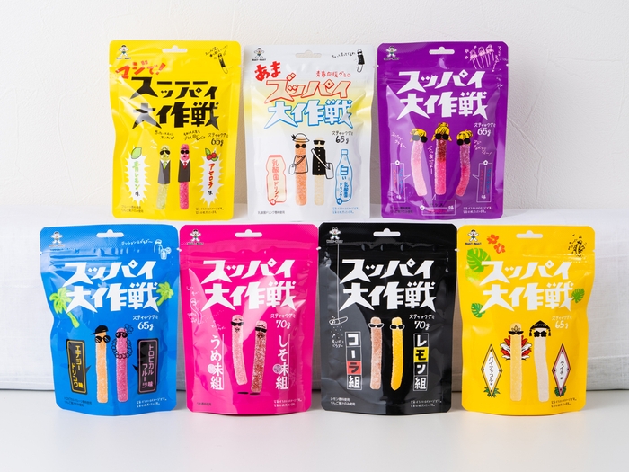 「スッパイ大作戦」は、ハードな食感と甘酸っぱいパウダーが特徴のスティック状グミで、やみつきになる食感と味わいがZ世代にも人気。2019年秋に「コーラ&レモン」の発売以降、10種類以上のフレーバーを展開し、全国のDAISOやスーパーなどで販売中の人気シリーズです。