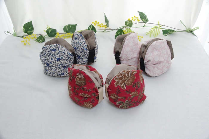 Jumou BASE店では、エレガントなレッドにドライフラワー調の花柄と、ウィリアム・モリスの「イチゴ泥棒」のグリーンとネイビーの計3色、楽天市場店ではBASE店と共通のレッド、優し気なピンクの花柄、さわやかな白地にブルーのボタニカル柄の3色をお求めいただけます。