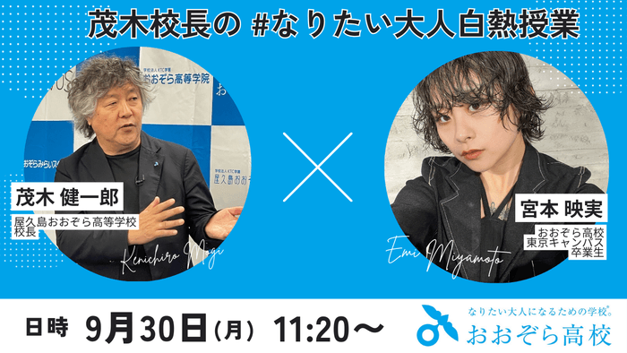 屋久島おおぞら高等学校の校長、茂木健一郎による#なりたい大人白熱授業は、おおぞら高校の卒業生と在校生が「#なりたい大人」について考える公開授業です。今回はアパレル業界で活躍中の東京キャンパスの卒業生をゲストにお迎えします。