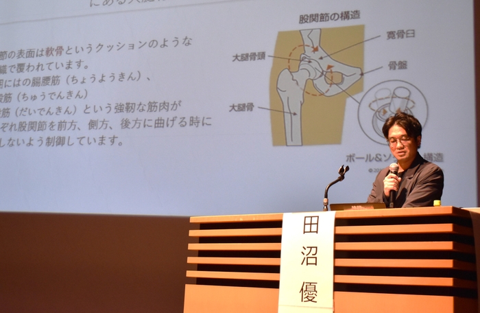 - 整形外科医による講演では、変形性股関節症の進行と健康寿命の関係を解説