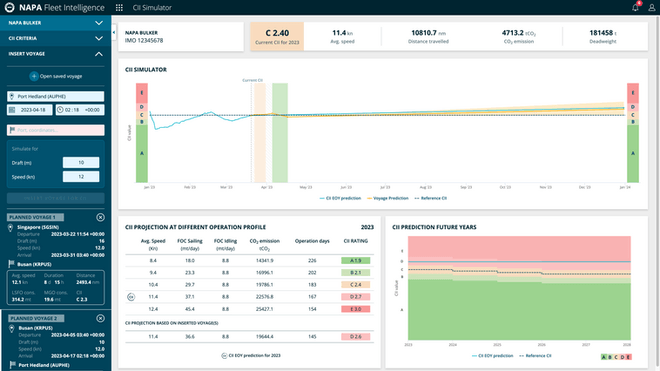 NAPA CII Simulatorは、船舶のデジタル・ツインと、過去および現在の航路や本船性能に関するデータを使用して、航路毎、または年末や所定の用船期間後など、年間の任意の日付におけるCII評価を予測します。重要なのは、このツールは、天候による航路変更、減速航行、船体洗浄、省エネ装置の設置など、さまざまなエネルギー効率対策や運航プロファイルが、船舶の将来の格付けに与える影響をシミュレートできることです。これにより、船主や用船者は、合意されたCIIの達成に向けて順調に進んでいるかどうかをより明確に把握することができ、また、特定の船舶に対してどのような対策が最も大きな効果をもたらすかについて、極めて重要な洞察を得ることができます。