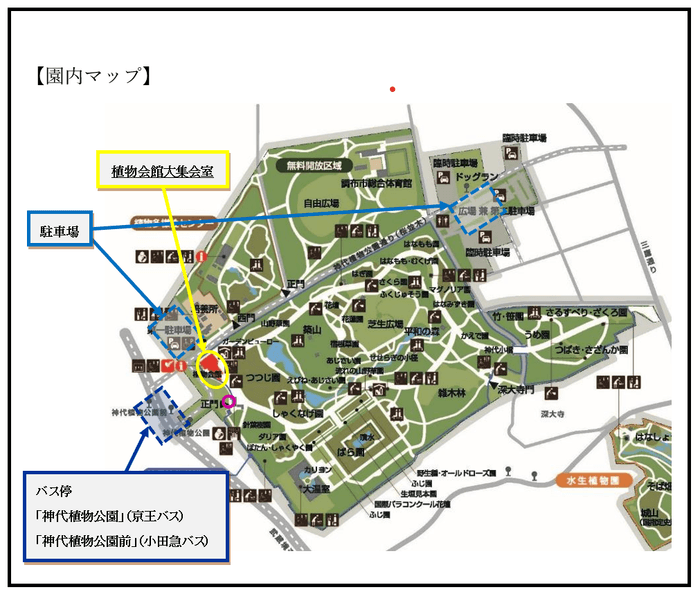 ・調布駅から小田急バス吉祥寺駅または三鷹駅行き「神代植物公園前」下車、または京王バス深大寺行き「神代植物公園」下車