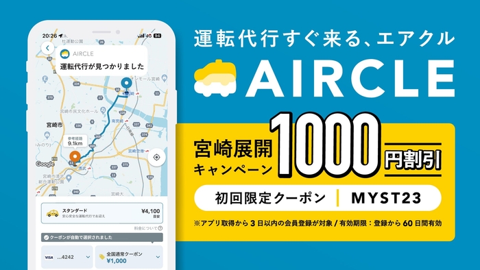 宮崎市との連携を記念して宮崎市内で使える「初回限定1,000円OFFクーポン」を提供します。事前にアプリ内でクーポン取得を行い、運転代行利用時にご利用ください。