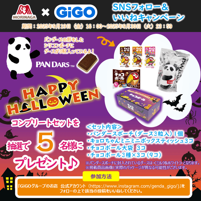 キャンペーン開催を記念して、対象の投稿をフォロー&いいねされた方の中から抽選で5名様に、「GiGO×森永製菓 ハロウィンキャンペーンコンプリートセット」をプレゼントいたします。