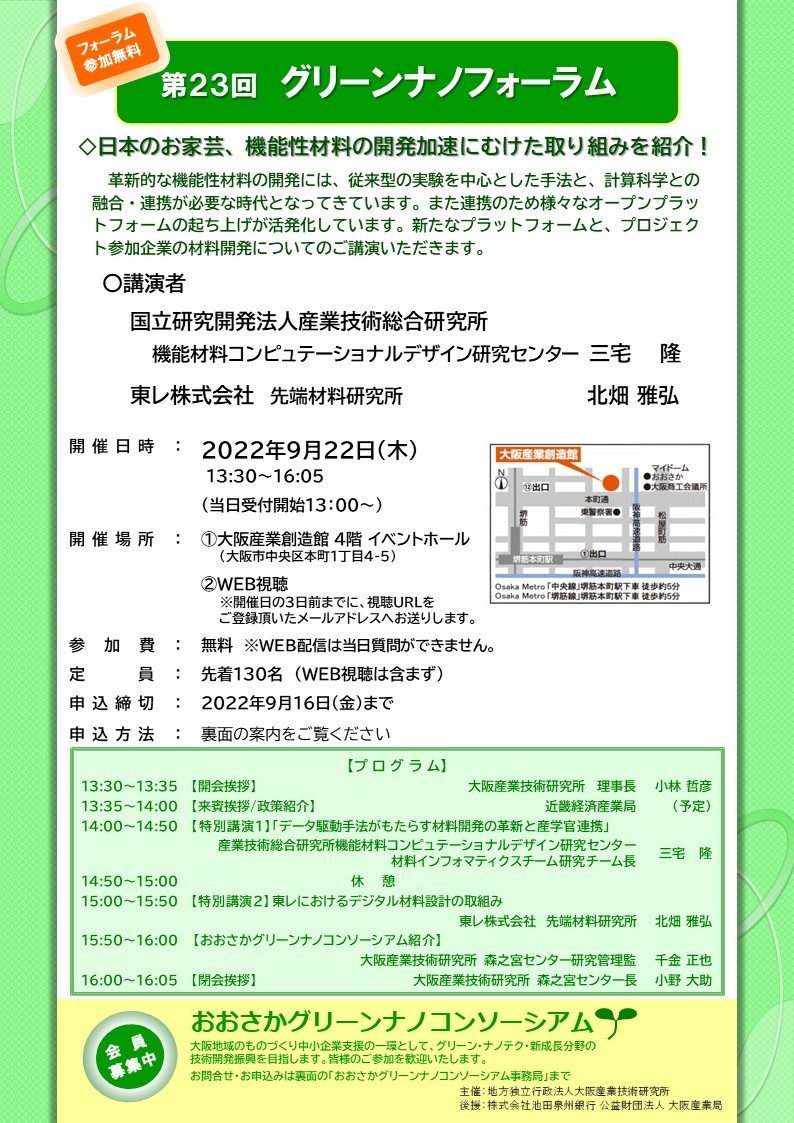 大阪産業技術研究所「第23回グリーンナノフォーラム」を 大阪産業創造館にて9月22日にリアル&WEB配信で開催