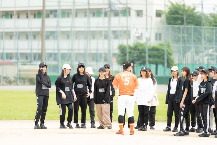 その後メンバーは、岩谷たちの指導のもと、キャッチボールやバットの素振り、ベースランニングをしながら、リアルな野球の感覚を体に覚えさせていった。真剣な顔つきでアドバイスを聞きながら、上手にプレーができるとメンバー同士でハイタッチをするなど笑顔で楽しんでいる様子。本番が待ち遠しくなる練習風景だった。