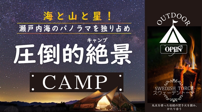 本キャンプ企画では、施設から一望できる瀬戸内海の大パノラマと気持ちの良い芝生による大空間で癒しと感動の極上キャンプが大切な人とご堪能いただけます。キャンプ初心者の方でもキャンプ道具一式が揃った『手ぶらで楽々コース』(調理器具、テント、寝袋、マット、ランタン、焚火台、キャンプ用コンロ、防火シート、スウェーデントーチ付)が用意されていますので安心です。