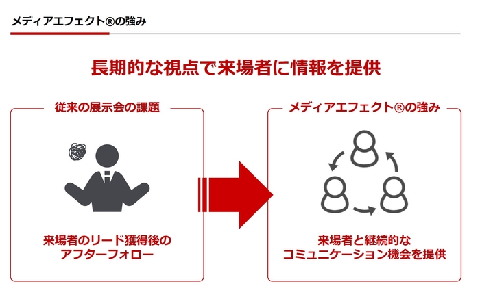 これまでのリアルイベントやオンライン展示会とは異なり、オンラインの強みを活かした長期的な視点で出展社と来場者の関係構築を強化するメディア一体型のオンライン展示会プラットフォーム。