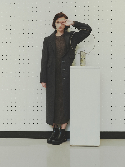 中に合わせたニットワンピースもまた、肩と袖に構築的な美しさをのせ、さらっと着るだけで女性らしい曲線美を映し出します。