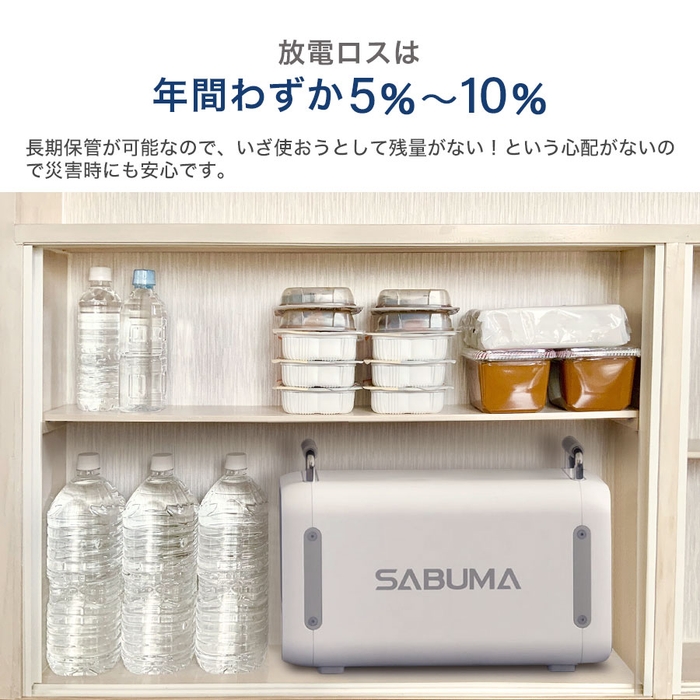 SABUMA S2200は、大容量2,258Whでありながら放電ロスは年間わずか5〜10%程度のため、電池残量が減りにくく長期保管に適しています。また、充電時間がスマホの充電よりも速いたった2.5時間でフル充電が可能です。