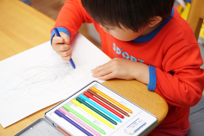 としてイスやテーブルを設置し、描くための台紙と色鉛筆を置き、
