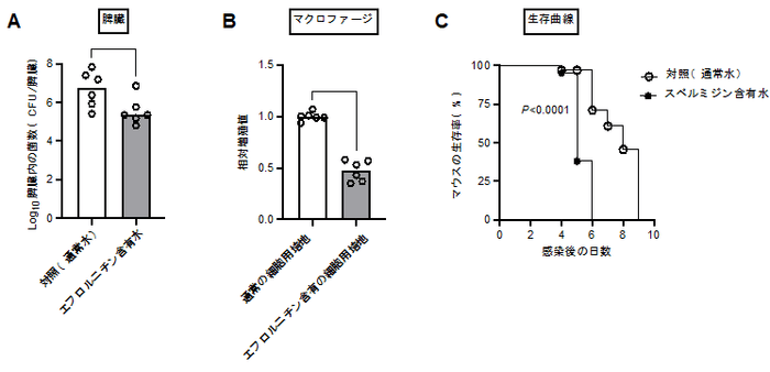 宿主内ポリアミンレベルとサルモネラ感染性の関係を明らかにするために、宿主ポリアミン合成の律速酵素であるオルニチン脱炭酸酵素の阻害薬エフロルニチンを、マウス飲水に加えました。エフロルニチン飲水マウスにおけるネズミチフス菌の脾臓内生菌数は、通常水を飲水した対照マウスと比較して、有意に減少していました(図4)。さらに、細胞培養液にエフロルニチンを加えると、マクロファージ様細胞に感染したネズミチフス菌の細胞内増殖能が減少しました(図4)。一方、スペルミジン含有水を飲水したマウスでは、ネズミチフス菌の感染能が上昇しました(図4)。さらに、ネズミチフス菌が感染したマウスのポリアミン量を測定した結果、感染していないマウスと比較して、糞便中および脾臓内のポリアミン量は明らかに上昇しました。これは、ネズミチフス菌感染により、アルギニンからオルニチン産生を促すアルギナーゼ活性の上昇が一因でした。これらの結果は、宿主のポリアミンレベルとサルモネラ感染の関係性を明らかにしたものであり、驚くべきことに、サルモネラは戦略的に感染宿主のポリアミンレベルを上昇させ、感染に有利となる状況を作り出している可能性を示唆するものです。また、宿主のポリアミン量を抑制することは感染制御につながることを示唆しています。