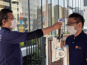 出社前・出社時の体温測定、手洗い・うがい・手指消毒の徹底、マスクの着用、一部手袋やフェイスシールドの着用