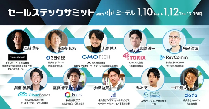 株式会社RevComm、ギグセールス株式会社、株式会社アイドマ・ホールディングス、株式会社セールスフォース・ジャパン、IRISデータラボ株式会社、CrossBorder株式会社、GMO TECH株式会社、facing株式会社、琉球アスティーダスポーツクラブ株式会社、株式会社UKABU、株式会社gamba、株式会社Retool、株式会社イメジン、ブランディングテクノロジー株式会社、株式会社ドゥーファ、トゥモローゲート株式会社、株式会社ジンジブ