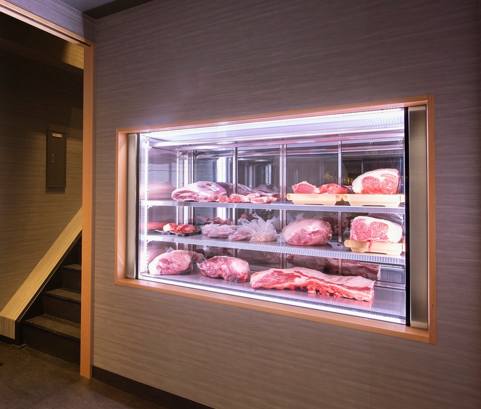 入口には世界初の1秒間に1兆回の振動を与える熟成庫が備えられ、1週間の熟成で約2ヶ月の熟成効果を得たA5の雌処女牛の飛騨牛が陳列され通る人の注目を集める。
