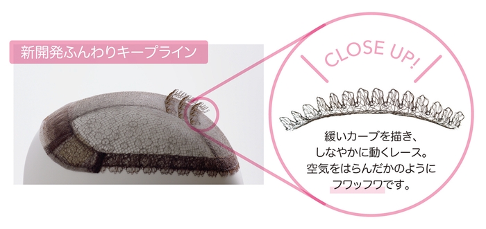 新商品『フリーディア 3』は、「1、2のポンポン」で簡単につけられる人気の「ピタッとキャッチ」に加え、気になる後頭部のボリュームをふんわり自然にキープする「ふんわりキープライン」を新たに採用しました。さらに「前髪なじみフロント」「ファインレース」で、より自由なスタイリングと自然なつけ心地を実感していただけるオーダーメイドウィッグです。