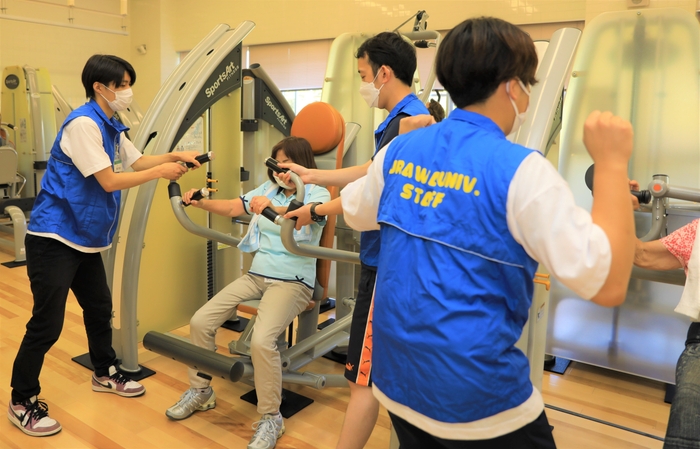 今年は3年ぶりとなる対面での開催が実現し、男性3名、女性22名の計25名の方が受講し、2022年9月26日(月)~12月19日(月)にわたり全6回(うち1回は体力測定)の講座を開催中です。本講座では、トレーニング機器を使った筋肉運動や、交流を目的としたレクリエーション等のプログラムを行い、また、専門大学ならではの生活に役立つ正しい健康情報を受講者に提供させていただくものです。
