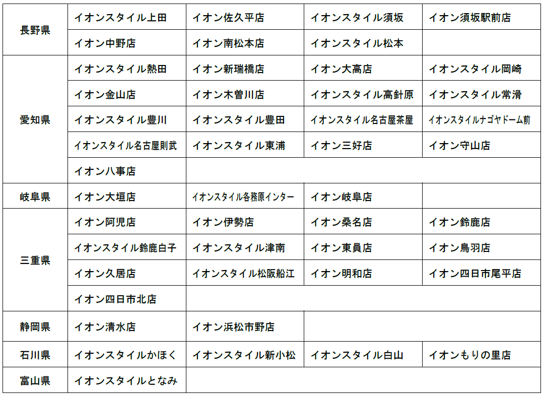 販売店舗:長野・愛知・岐阜・三重・静岡・石川・富山県内の「イオン」「イオンスタイル」47店舗