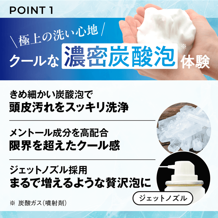 きしまない、オールインワン処方の最強クールシャンプー。濃密炭酸泡×モイスト処方でメントール高配合により刺激的なクール感を実現!シャンプー中からヘアドライまで爽快感が続く!