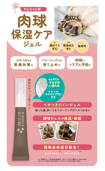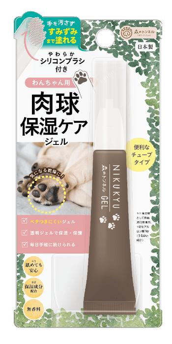 「肉球の乾燥」は、素足でのお散歩などで起こりやすいです。硬いアスファルトや、夏に熱くなったアスファルトを素足でお散歩しているわんちゃん。やわらかい肉球も、かっちかっちになってひび割れを起こすこともあります。保湿クリームを使っている飼い主さんもいらっしゃいますが、クリームだとフローリングで滑ってしまうとのお声も。そこで肌なじみのよいジェルタイプに。滑りにくく工夫しました。しっかり馴染んでベタつかないのですぐに歩いても大丈夫です。